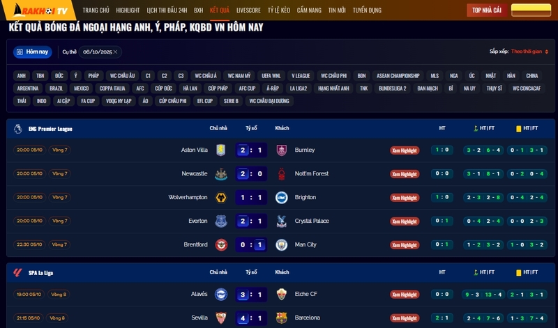 Ấn tượng đầu tiên của mình khi vào Rakhoi Live chính là phần kqbd được bố trí cực kỳ khoa học. Không cần tìm kiếm phức tạp, ngay đầu trang đã hiển thị danh sách các trận bóng đá đang và đã diễn ra trong ngày, chia rõ từng giải đấu.