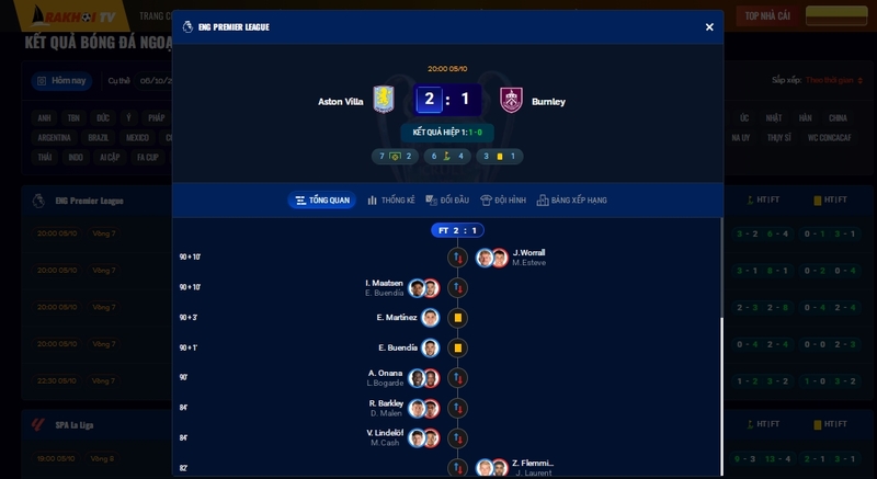 Anh em nào chỉ cần xem nhanh đội mình yêu thích có thắng không thì nhìn lướt một cái là nắm liền. Còn ai muốn soi sâu hơn – như diễn biến hiệp 1, bàn thắng từng phút, thẻ phạt, cầu thủ ghi bàn – chỉ cần nhấn vào trận đấu, Rakhoi Live sẽ mở ra bảng chi tiết đầy đủ.